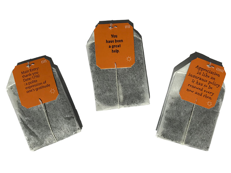 Each tin contains 25 tea bags of quality English Breakfast tea individually tagged with witty, thoughtful, thank you quotes.